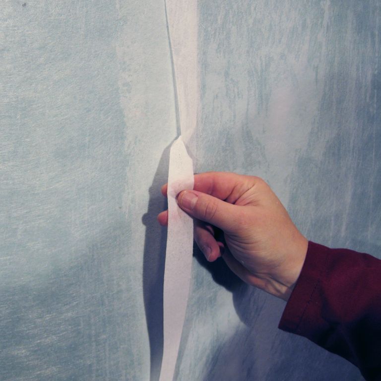 - одним чётким движением, которое может быть слегка волнообразным, прорежьте два полотна вместе (старайтесь сделать прорез аккуратно, без излишнего надавливания на нож, чтобы не повредить поверхность, на которую Вы наносите малярный флизелин);